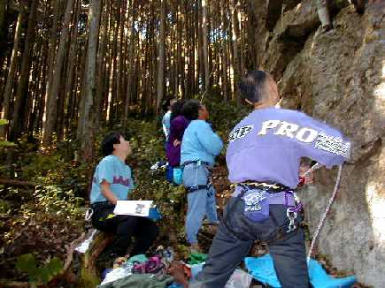 リーダーの辻君が、新横浜の怪しげなタワーにいる美鈴ちゃんに会いに行くということでキャンセル。全員朝だちとなる。午前中は小竹、山本、大山、宇山夫妻、吉村、壬生でザイル講習会。結び方、自己ビレイ方法、クリップ技術をやる。次回ザイル開きでは、ダブルロープによる実践クライミングと、懸垂下降をやるつもり。乞うご期待。