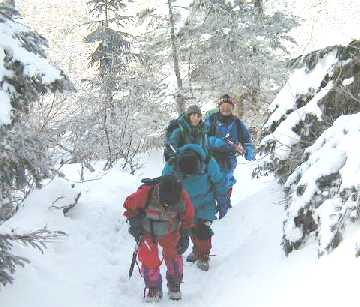 美濃戸まで車で入り、行者小屋まで約2時間半。たくさんのお酒と食料で荷物が重い!テントを設営して地蔵尾根から赤岳に登る。やや風が強く、方冬山本番といった感じだ。それでも山頂までは1時間半、下りは文三郎道を転がるように下りて2時半にはテントに着いてしまった。小山さん持参のチーズケーキで遅れ馳せながらのクリスマスを祝う。そのあとはいつもの大宴会になったことはいうまでもありません。