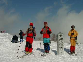戸隠スキー場からクワッドリフトを2本乗り継ぐと、もう1748mの瑪瑙山山頂だ。ここから目指す飯綱山までは稜線沿いにわずか170mの標高差。スキーヤーで賑わう瑪瑙山山頂をあとに、新雪の積もった斜面をいっせいに滑り下りる。だが颯爽にとは行かないのが山雀山スキー軍団の悲しいところ。転倒者続出、早くも1名リタイアとなってしまった。