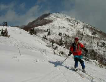 | 危なげな態勢で滑る伴氏。奥は飯綱山への稜線 | ![]() |