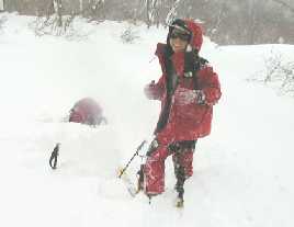 快適な小屋で山スキーと酒の快適な日を過ごすことを夢見て参加したものの、折からの大雪で笹ヶ峰までの林道はスキーを着けても膝を越すラッセル。3人では時速1キロがせいぜい。結局時間切れで敗退。スキー場に戻り、京大OBの所有するヒュッテに急遽泊めてもらうことになりました。