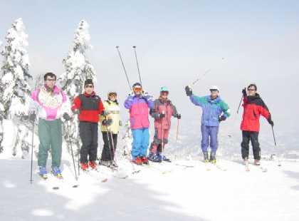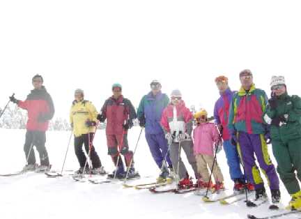 快晴の天元台で皆一緒に滑って遊ぶ。五反田氏は晴男に変身したのではなく、冬眠中らしい。宇山(茂)氏も来年は山スキーだ!と張り切っている。